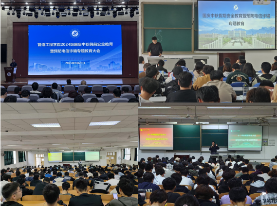 为切实增强学生的安全防范意识,有效预防电信诈骗案件的发生,确保学生度过一个安全、祥和的假期,在国庆、中秋双节来临之际,9月24日-9月28日,管道工程学院各年级均开展了国庆中秋节前安全教育暨预防电信诈骗专题教育大会。