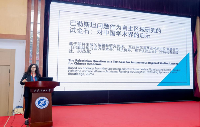 西北大学中东研究所Walaa Alqaisiya博士作题为《The Palestinian Exception in Western Academia:Implications for Chinese Region and Country Studies 》的主旨报告,通过揭示知识生产体系如何被帝国主义利益结构性侵蚀的重要标尺,剖析了西方学术界在巴勒斯坦问题研究中的系统性缺陷,探讨这些经验对构建中国区域与国家研究自主框架的启示。